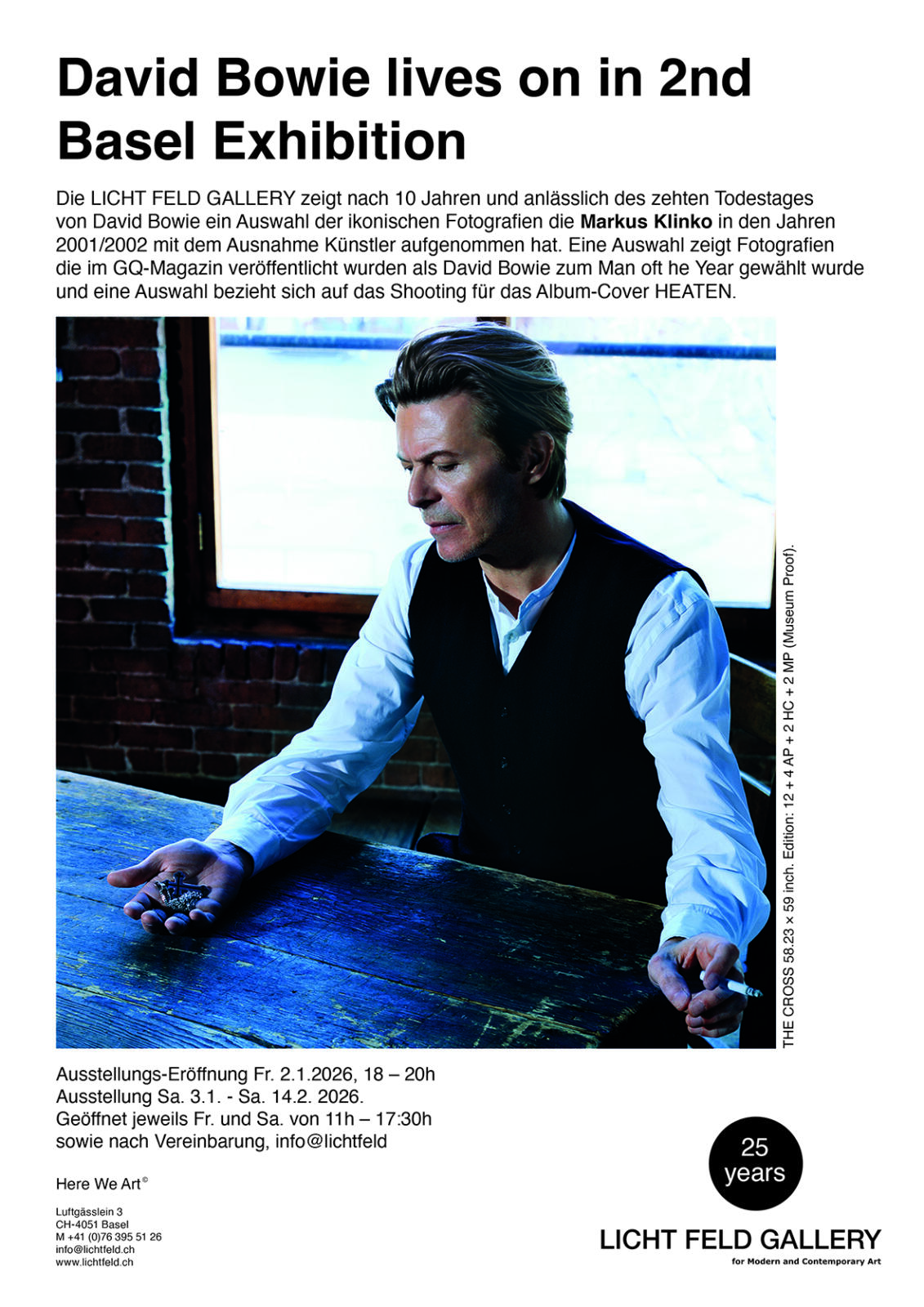 After 10 years and on the occasion of the tenth anniversary of David Bowie’s death, the LICHT FELD GALLERY is showing a selection of iconic photographs taken by Markus Klinko in 2001/2002 with the exceptional artist. One selection shows photographs that were published in GQ magazine when David Bowie was voted Man of the Year, and another selection relates to the shoot for the album cover HEATEN.